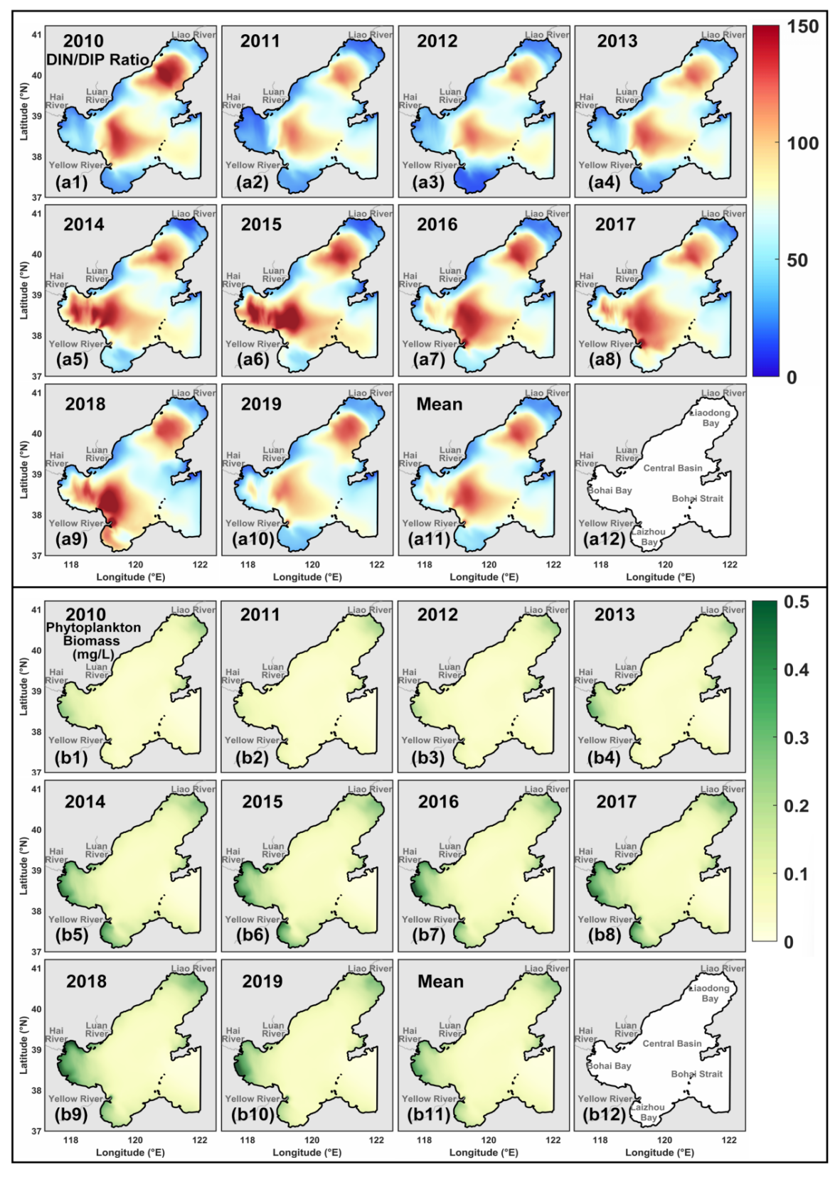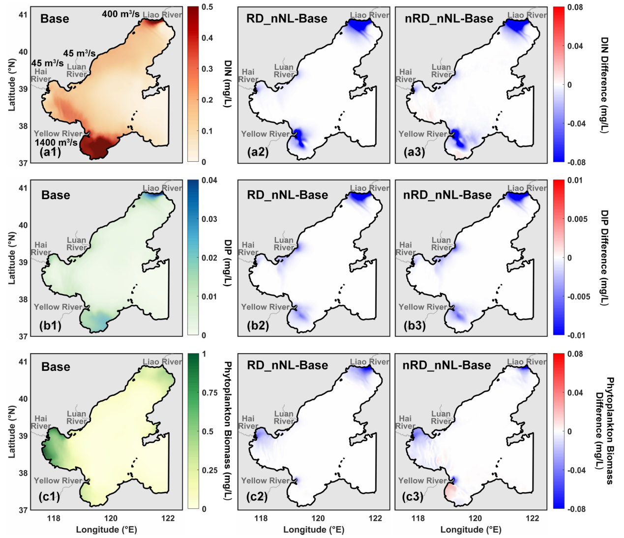 随着经济的迅速发展与工农业活动的频繁进行,陆源排放导致过去数十年间海洋中营养盐负荷显著增加,进而引发了河口及近海区域浮游植物大量生长,破坏了海洋环境的生态平衡。作为海洋生态系统健康的关键指标之一,浮游植物生物量对于海洋生态系统生物地球化学过程研究具有重要价值。因此,浮游植物的动态变化逐渐成为海洋生态系统研究的焦点。近日,名贯彩票康欣奕助理研究员所在团队基于耦合的水动力-生态模型探讨了2010 - 2019年非冰期内渤海营养盐和浮游植物生物量的时空变化特征,深化了对渤海生态系统动态特性的理解。
