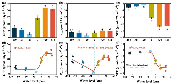 该研究设计包括地下100 cm至地表以上40 cm的六个水位梯度(-100 cm、-60 cm、-20 cm、0 cm、+20 cm、+40 cm),全面模拟湿地不同水文条件下的生态响应。长期监测发现,生态系统净CO₂交换(NEE)对水位变化呈非线性响应,并在-20 cm至0 cm之间出现明显阈值。水位升高至地表以上时,生态系统碳汇功能显著增强(图1)。