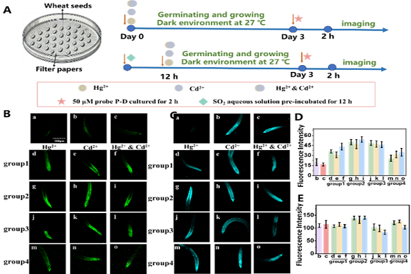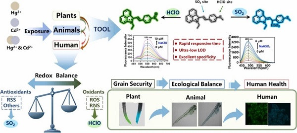 探针D-P的分子结构中,苯基硫醚与C=C双键分别作为次氯酸(HClO)和二氧化硫(SO₂)的特异性响应位点;二者与对应底物反应生成不同化合物,并产生不同发射波长的荧光,从而实现对HClO和SO₂衍生物的区分检测(图1)。该探针能有效应用于植物、斑马鱼及人类细胞中,实时监测HClO与SO₂衍生物的动态变化。研究显示,重金属Hg2+/Cd2+复合暴露可引起植物和人体细胞中活性氧物种(如HClO)含量显著上升,复合暴露进一步加剧机体氧化应激水平,且存在协同增强效应。与此同时,机体通过激活自我防御机制调节 SO₂ 衍生物的生成量,以应对氧化损伤并试图维持氧化还原平衡。因此,SO₂ 衍生物的变化可间接反映细胞抗氧化应激的过程。