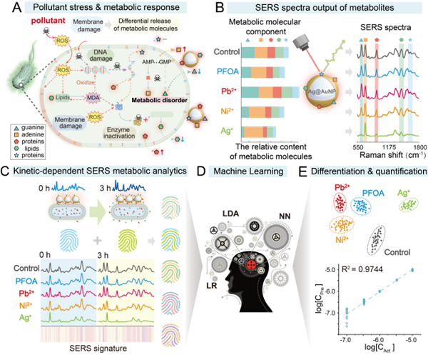 全细胞生物传感器(WCB),是通过测定活细胞(如细菌)对外界污染物等刺激的响应,实现对目标物或相关参数的检测。因其能够反映污染物的生物可利用性与毒性,WCB技术已成为环境分析中的重要工具。然而,传统WCB多依赖荧光、生物发光等低维输出信号,难以实现多种污染物的区分与识别。表面增强拉曼散射(SERS)光谱技术具有分子指纹、高灵敏、无损、免标记等优点,能够识别多种生物代谢分子,并获取细胞体系丰富的代谢信息,可灵敏监测细菌代谢产物的变化。本研究发展了基于无标记SERS的WCB新策略,通过采集细菌在污染物刺激下的无标记SERS光谱,直接捕捉其代谢响应,并结合机器学习方法,将特征SERS指纹与污染物的种类和浓度建立对应关系,从而构建用于多种污染物检测的传感新方法。图1展示了“SERS-WCB”的传感原理:当污染物与细菌接触后,细菌受刺激触发应激反应,引起代谢通路变化,进而改变代谢产物的组成与含量。由于不同污染物对细菌的毒性作用机制存在差异,其诱导的代谢响应亦具有显著区别。通过SERS技术检测这些代谢产物的指纹信息,可进一步构建基于细菌应激响应的指纹数据库与机器学习模型,最终实现对不同污染物的区分与定量分析。