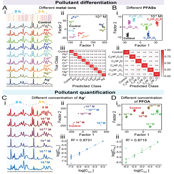 本研究创新性点二:提出了一种动力学依赖的多维SERS代谢分析策略(图2),通过捕捉污染物胁迫下细菌代谢产物释放行为的动态差异,并结合细菌生长阶段的优化调控,显著提高了传感器对污染物响应的灵敏度。进一步借助经优选的机器学习分类与回归模型进行特征提取与数据解析,实现了在标准溶液和实际海水中对不同种类与价态的重金属离子(10⁻⁶ M)以及结构相似的全氟化合物(PFOA,10⁻⁵ M)的精准区分与识别(图3)。而且在海水中验证了该SERS-WCB方法对典型污染物(如Ag⁺、PFOA)的定量检测能力,表明该方法在复杂海岸带介质中应用前景广阔。