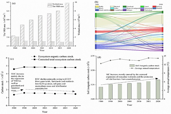 图1 1980~2020年黄河三角洲及湿地面积变化(a)、土地利用变化桑基图(b)、生态系统有机碳和总碳储量变化(c)、土壤无机碳储量与年均气温变化(d)