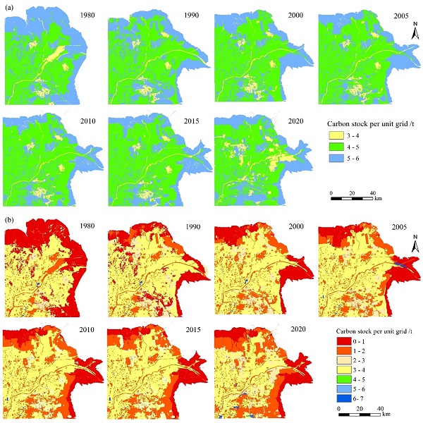 图2 黄河三角洲1980~2020年土壤无机碳(a)和生态系统有机碳储量(b)的空间分布
