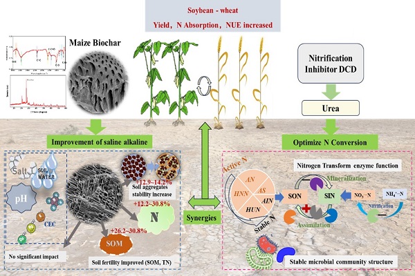 Chunxiao Yu,Hongpeng Chen,Biao Tang,Hanwen Liu,Xiaoling Liu,Haibo Zhang,Guangmei Wang. Biochar integrate dicyandiamide modified soil aggregates and optimized nitrogen supplying to boosting the soybean-wheat yield in saline-alkali soil. Soil and Tillage Research. 2026. 257,106922.https://doi.org/10.1016/j.still.2025.106922.
