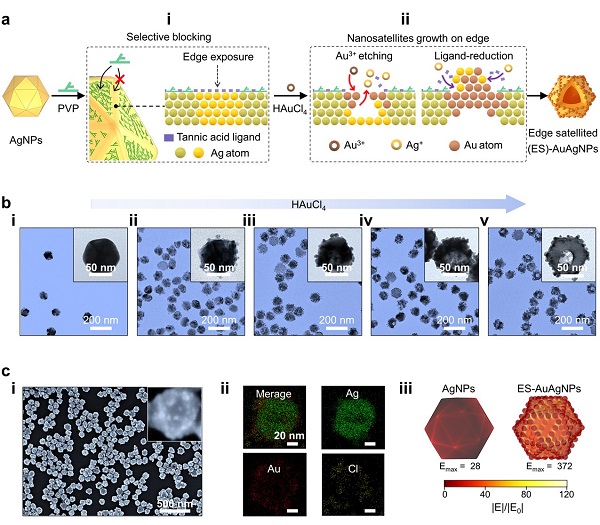 图1.ES-AuAgNPs的表征数据。(a)合成原理;(b)不同HAuCl4浓度下制备的透射电镜图;(c)扫描电镜图、元素成像图以及三维电场模拟图。