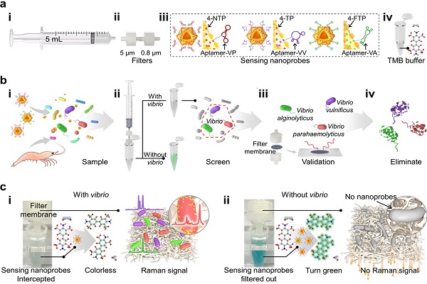 图3.弧菌“筛-鉴-灭”一体化平台的构建。(a)组件;(b)一体化流程;(c)分析原理。