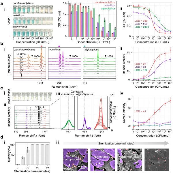 图4.弧菌“筛-鉴-灭”一体化平台的三功能评估。(a)基于类过氧化氢酶的显色筛选功能;(b和c)基于SERS的鉴别功能;(d)基于纳米银的灭菌功能。