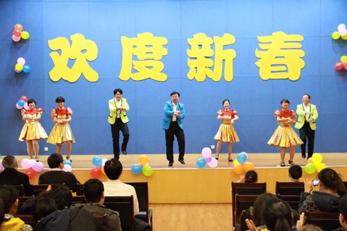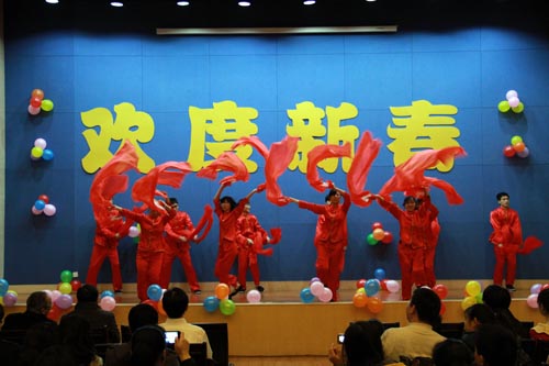 金龙腾飞、银蛇起舞,2013年2月1日下午,名贯彩票党政班子成员、全体职工和研究生齐聚一堂,唱响和舞动蛇年新春。