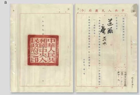 图1 中央人民政府颁发中国科学院印信的政府令(a)和中国科学院成立大会(b)