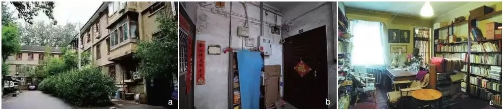 图5 中关村“特楼”外景(a)及其内部的郭永怀和李佩故居门口(b)、钱三强和何泽慧的书房(c)