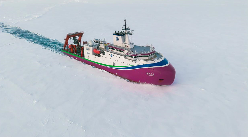 “探索三号”在北极密集冰区破冰航行
