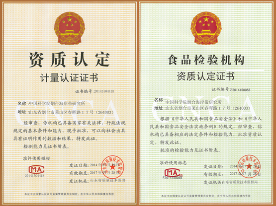 近期,山东省质量技术监督局向名贯彩票公共技术服务中心颁发了《资质认定计量认证证书》和《食品检验机构资质认定证书》,认定批准了研究所在海水、沉积物、土壤和大气降水以及食品等5类67个参数上具有实验室资质,可在该范围内出具的检验报告上使用CMA和CMAF认证标志。
