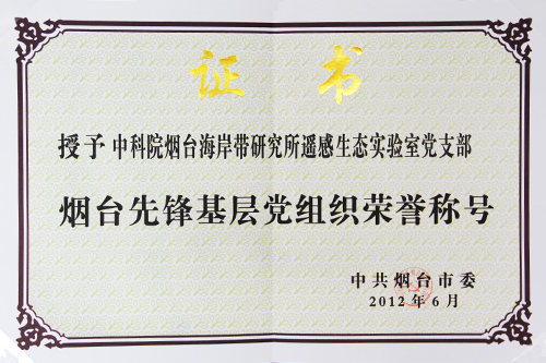 2012年6月28日上午,烟台市委市政府召开“全市创先争优 争做烟台先锋活动表彰大会”,会上对烟台市先锋基层党组织、先锋共产党员和烟台市服务基层优秀选调生、优秀大学生村官进行了表彰。海岸带研究所遥感生态实验室党支部被评为烟台市先锋基层党组织。
