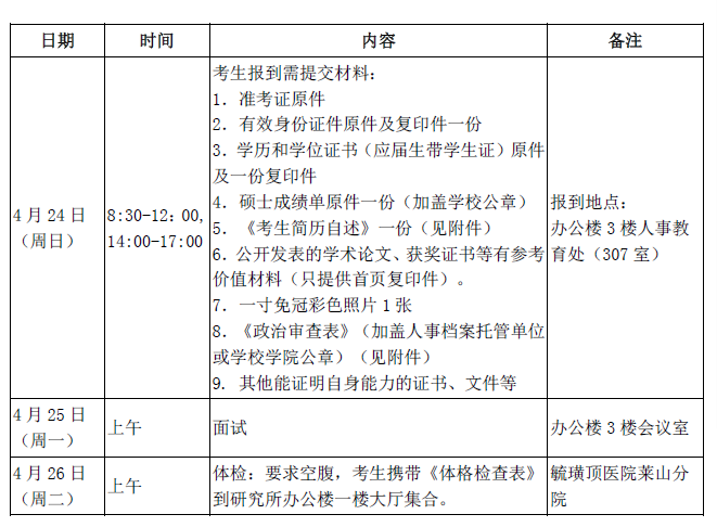 2. 考生面试来回交通费及餐费自理。所有考生的体检费以及非烟台市区考生4月24日至4月26日的住宿由我所统一安排(免费),考生来所可先本人有效证件凭入住海岸带所公寓楼的招待所(电话:0535-2109328)。