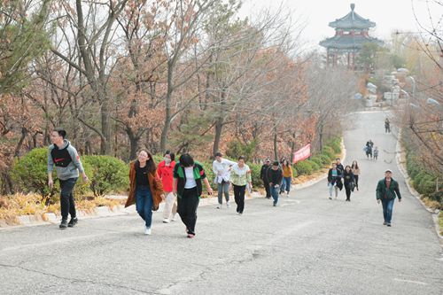 本次运动会,参赛职工与研究生自由组队,各团队从研究所集合出发,按规定路线徒步行走,一一取得通关卡片直至攀登至莱山区凤凰山顶。在凤凰山山顶,团队成员分工合作分别完成转呼啦圈、踢毽子、跳绳三个项目。根据各团队徒步、登山及参加趣味活动的总用时决出一等奖一组、二等奖三组、三等奖五组。