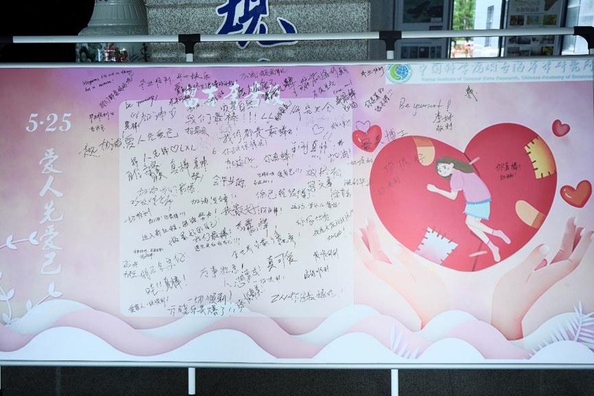 5月25日,工作人员在办公楼大厅设立了心灵驿站,布置了心理知识科普小展板和留言夸夸板,发放了心理健康小贴士和减压小礼品。活动现场气氛热烈,同学们纷纷留言,表达对自己和他人的赞美和鼓励。6月1日下午,研究生会又组织了趣味运动会,共有14支队伍、80余人参加了接力赛、心心相印背夹球、五人六足、指压板投篮等六个项目,展现了师生们良好的体育精神和团队合作意识。投稿征集活动通过线上方式进行,鼓励同学们分享珍藏的治愈系影音作品和书籍,以及自己的科研经历和心得,活动收到了多份优秀的投稿。