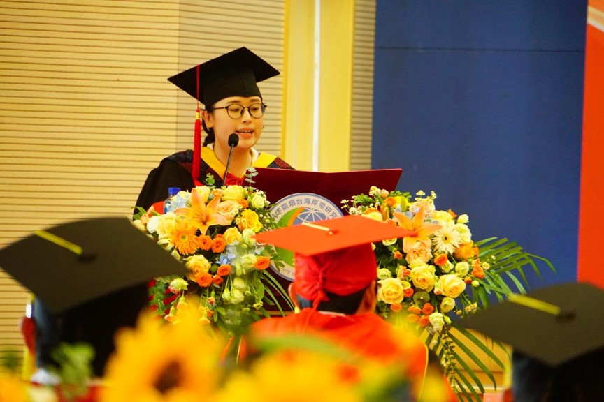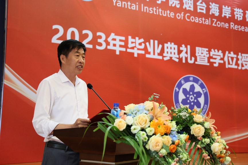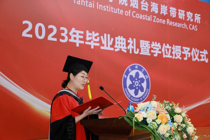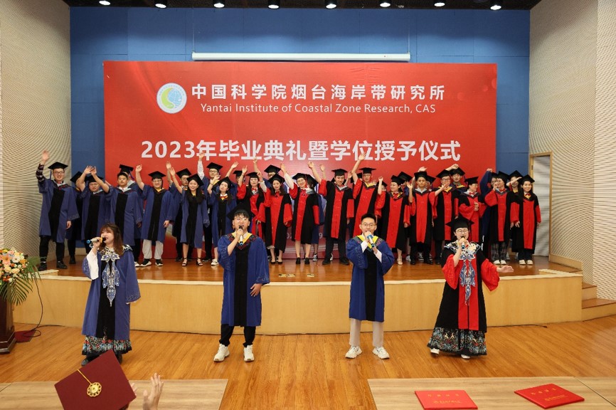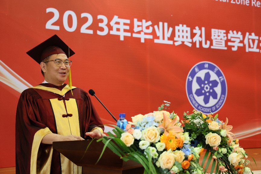 学位评定委员会主席秦松宣读了2023届毕业生学位授予名单,并与学位评定委员会副主席韩广轩一同为毕业生拨正流苏。随后,秦松为即将开启新征程的毕业生们发表了题为“梅竹啖雪菊摇霜,满园青翠满园芳”的毕业致辞,对全体毕业生表示祝贺和感谢,希望同学们作为国科大学子,日后要像“竹”一样在逆境中积累,在顺境中把握机遇,蕴累锋芒待春雨,身披金甲冲九霄。像“梅花”一样把奋斗内化成习惯,已是悬崖百丈冰,犹有花枝俏。像“菊”一样豁达,接受平凡但不平庸,一蓑青烟雨,独钓满江鱼。最后,秦松副所长(主持工作)期盼同学们在未来“守初心,担使命,耐得住寂寞,在实践中快速成长,护的了盛世家国。以赤子之心勇担家国重任,怀青云之志创造美好华章。”随后由博士毕业生王晓晴,硕士毕业生于汶莉、孙超凡、王小丹领唱,全体毕业生合唱歌曲《凤凰花开的路口》《入海》,庆祝2023届毕业生顺利毕业。