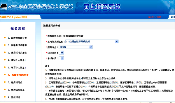 2. 填写选择报考的专业时,报考院系所选择:(180)烟台海岸带研究所: