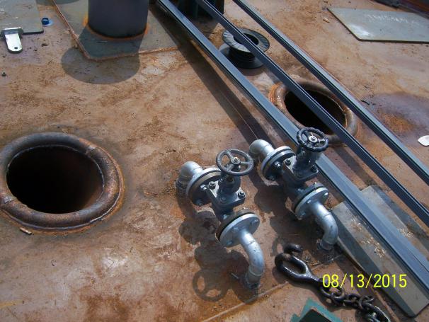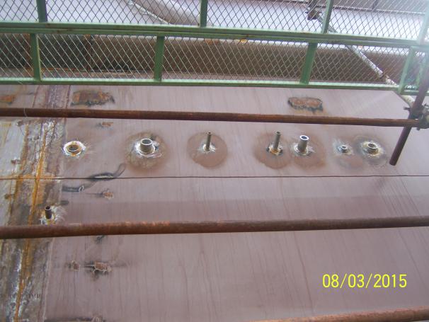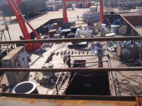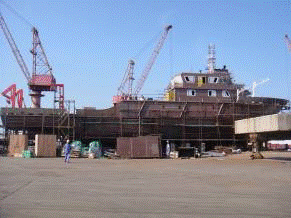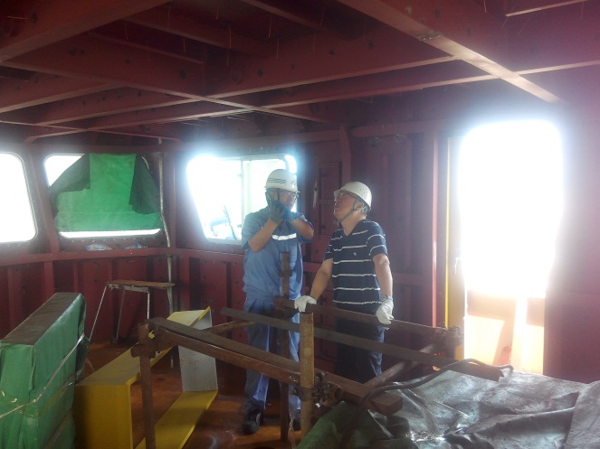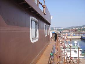 主船体成形(601$201$202$801$901$902$903分段)(详见附图) 雷达桅:已经完成(详见附图) 甲板设备基座安装焊接,除系泊设备基座外,基本完成(详见附图) 船体照光完成 外板锌块除海底阀箱内部其余全部安装完成 罗经甲板和艏楼甲板的外部门窗已经安装完成(详见附图) 所有分段油漆已完成(详见附图) 船体外板油漆修补进行中 房间内部油漆修补进行中 舱室密性检验:已经完成 舱室强度检验:正在进行中 |