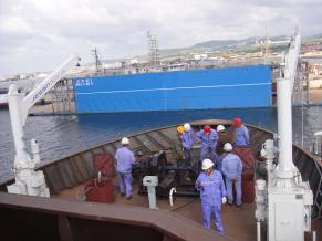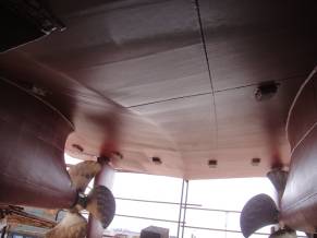 船舶下水前 环氧试块硬度测量?艉管密封面密性?艉管法兰螺栓扭矩?艉轴/艉管清洁?艉轴间隙?轴下沉量?艉轴液压联轴器的压装?舵零位及灵便性检查?轴艏艉密封检漏?ADCP安装及密性?外露螺栓紧固件保险上紧?水线下排舷外管线安装及密性?水线上排舷外管NDT?海底门管路完整性等事项进行现场检查确认,主机?齿轮箱及CPP液压动力站等机舱设备已吊装上船,并进行有效的防护 船舶下水后 外协管工对机舱?甲板及上建区域的管路进行施工;下水后外协钳工进行轴系对中的准备工作,并对艉轴重力油柜?绞车基座止推块进行现场定位?安装 |