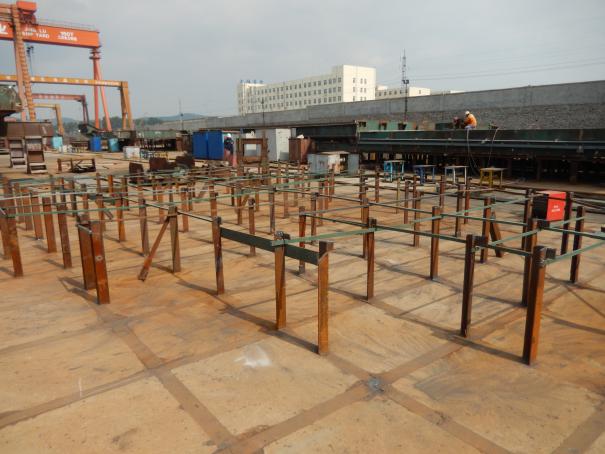 201分段:分段已经完成→船台合拢中(详见附图) 202分段:分段已经完成→船台合拢中(详见附图) 601分段:钢板抽检→预处理→钢板切割→甲板拼板→上胎架→分段小组立制作完成→框架完成→预舾装件安装完成→铺外板→正在制作艉轴包(详见附图) 801分段:钢板抽检→预处理→钢板切割→甲板拼板→上胎架→分段小组立制作完成→框架完成→预舾装件安装完成→铺外板(详见附图) 901分段:钢板抽检→预处理→钢板切割→甲板拼板→分段小组立制作中(详见附图) 902分段、903分段、904分段:钢板抽检→预处理→钢板切割→分段小组立制作中(详见附图) |