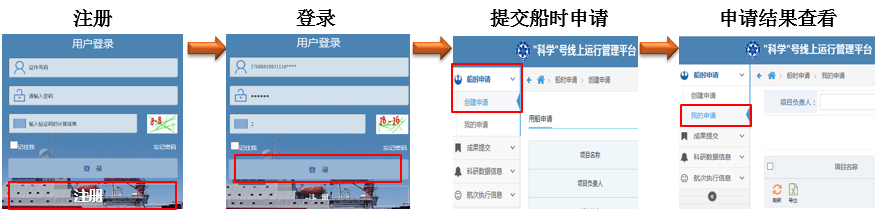注册并登录“科学”号线上运行管理平台,在线填报用船计划(申请步骤见附件1) |
