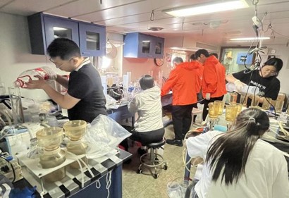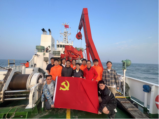 本航次科考团队共有党员12名,航次期间“逐浪引航”临时党支部组织科考队员深入贯彻中央八项规定精神学习教育,开展学术讲座等活动,宋书群作了题为“陆海统筹的河口海湾水生态系统健康诊断及调控”的报告;柴召阳博士作了题为“沉积物中甲藻孢囊指示环境演变”的报告,推动了党建工作与科研业务深度融合,让党旗在海上科考前沿高高飘扬。